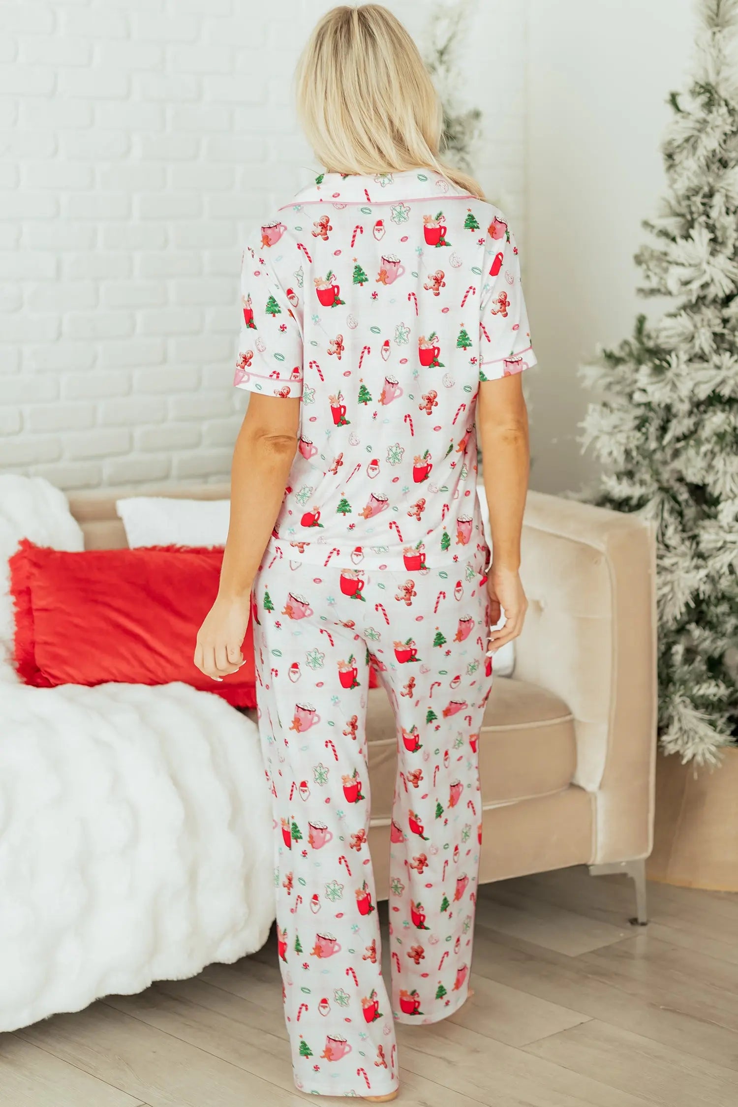 Pink Christmas Spirit Cute Holiday Print Short Sleeve Shirt and Pants 2pcs Pajama Set